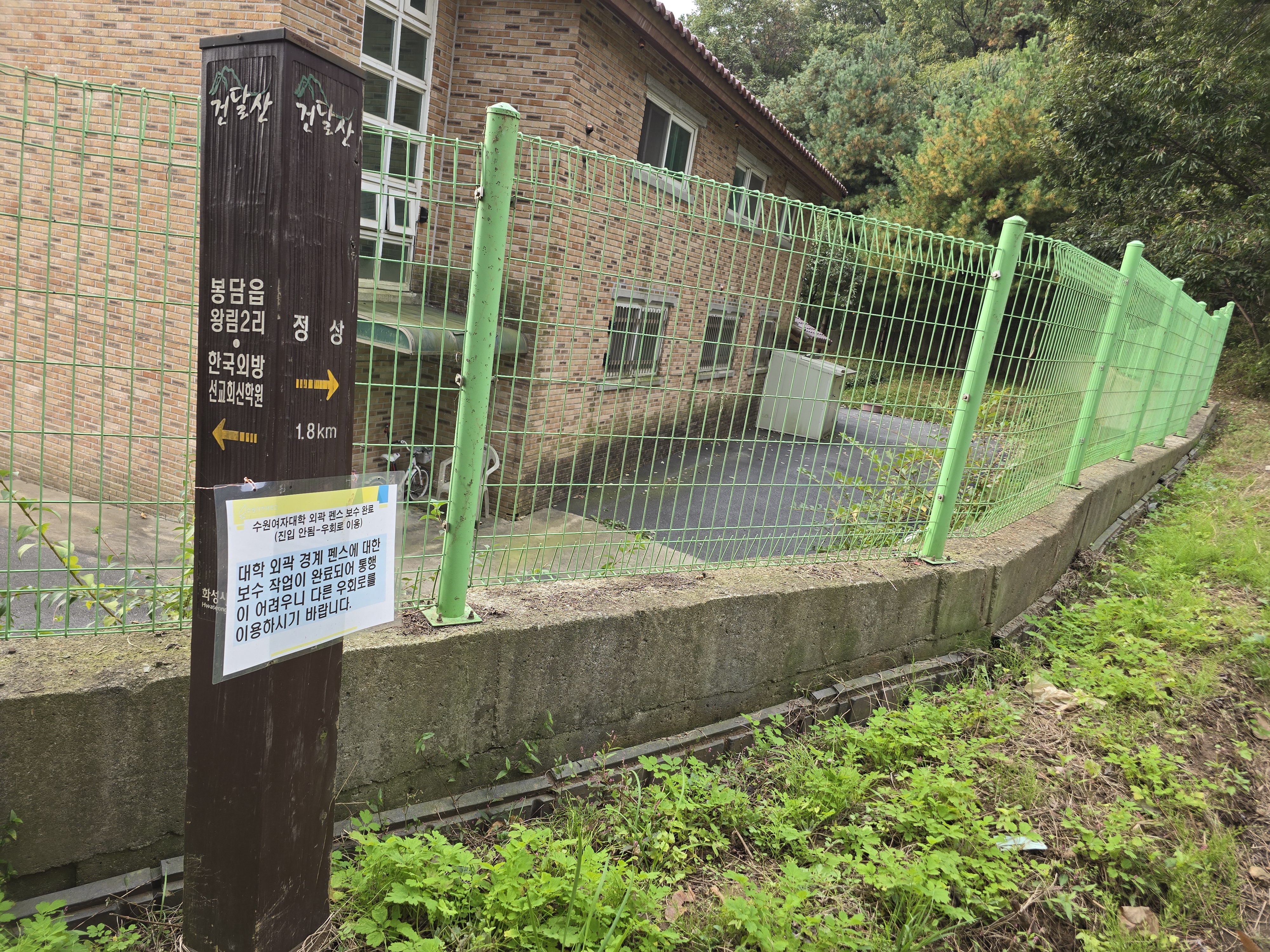 수원여대해란캠퍼스에서 오르는 등로는 폐쇄하고 창훈묘원에서 오르는 코스를 개설했다는 안내문