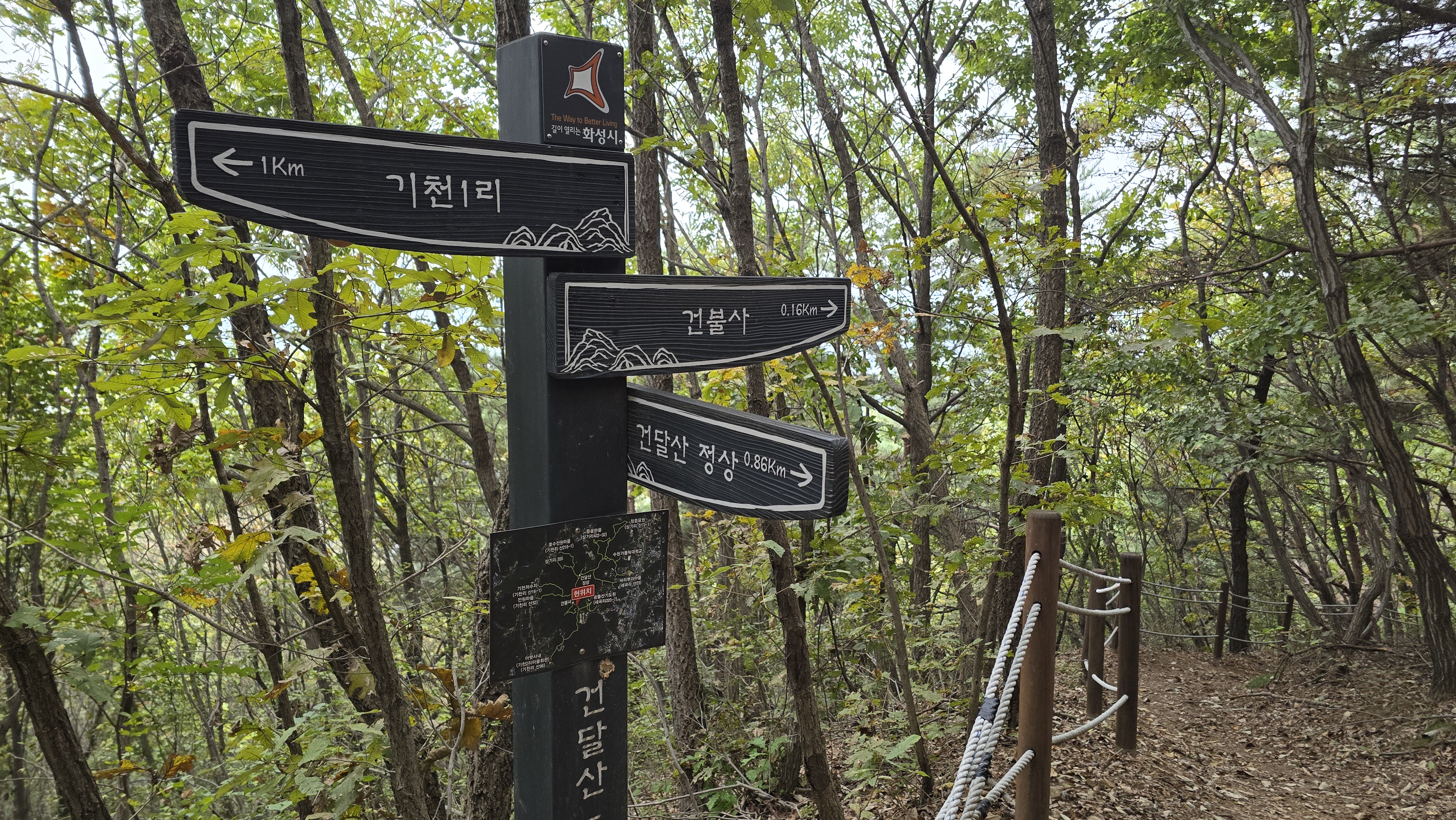 이정표에 부착된 사각 등산지도에 건불사로 가다가 흰돌산수양관을 가리키는 안내도가 설치되어 있다.