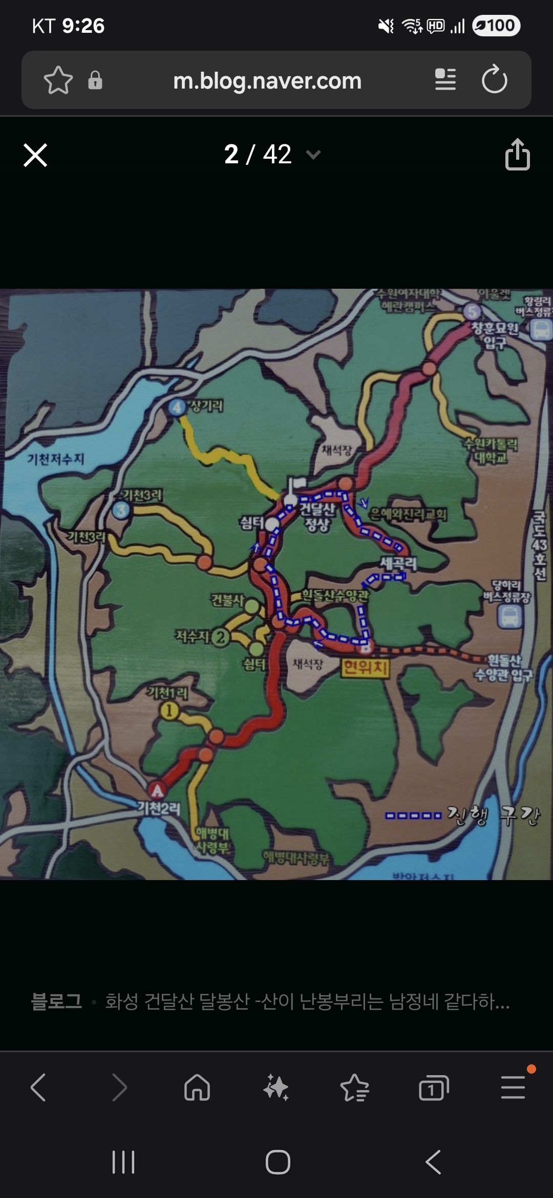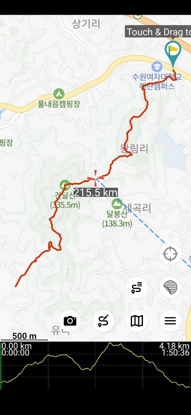 ㅇ코스 : 창훈묘지(수원여대 해란캠퍼스 옆)_채석봉_조원기신도비 _세곡리갈림길_건달산_건불사/기천1리 갈림길(흰돌산 수양관 갈림길)_건불사_기천1리 마을회관_기천리 보건진료소 (약 4km)