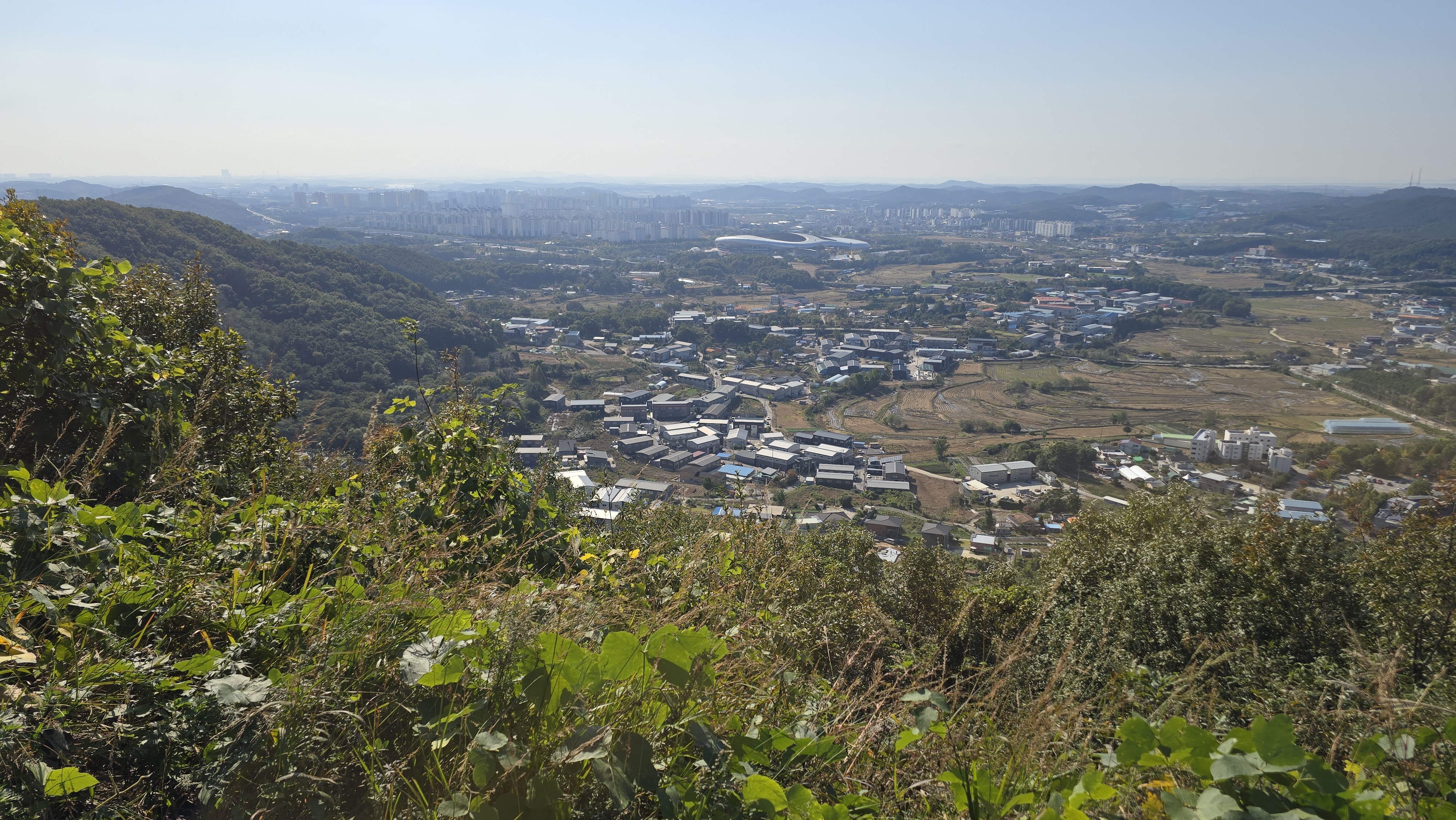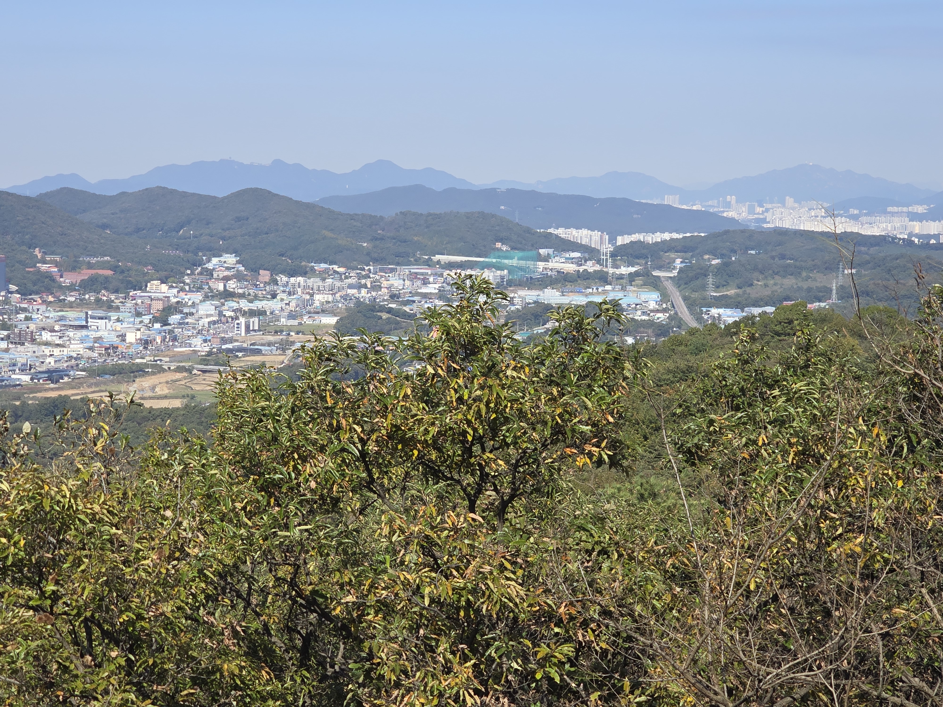 들머리에서 건달산 조망 이틀 전에 좌측 끝으로 하산해서 우측 아파트 근처까지 4km 이동 했다.