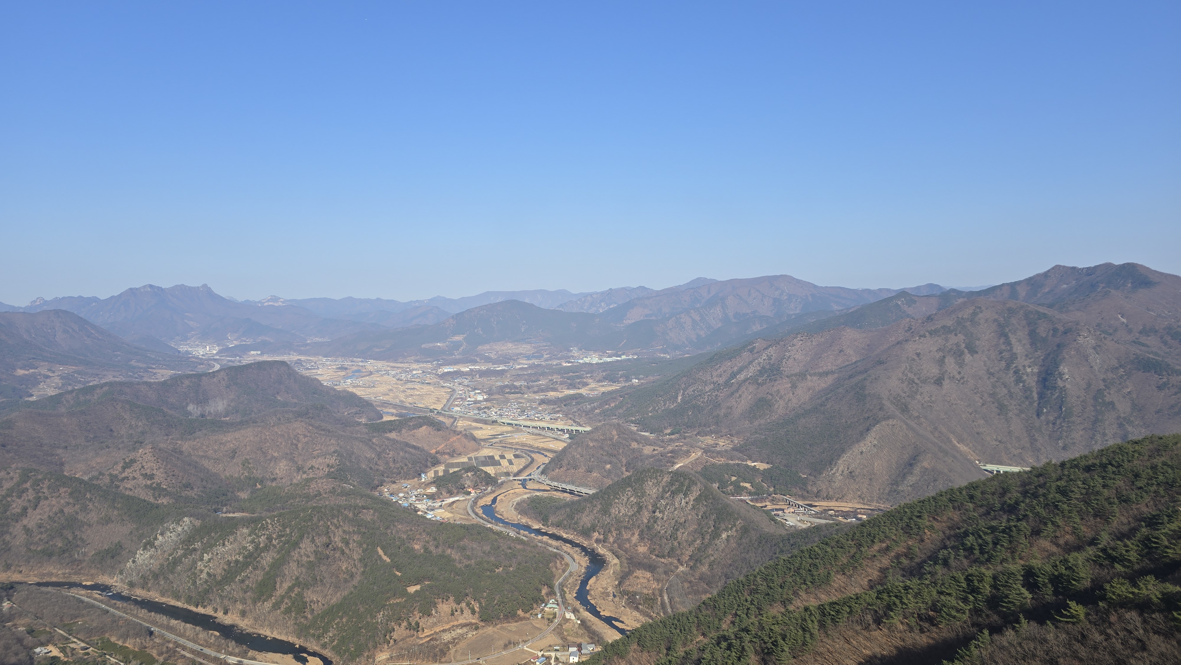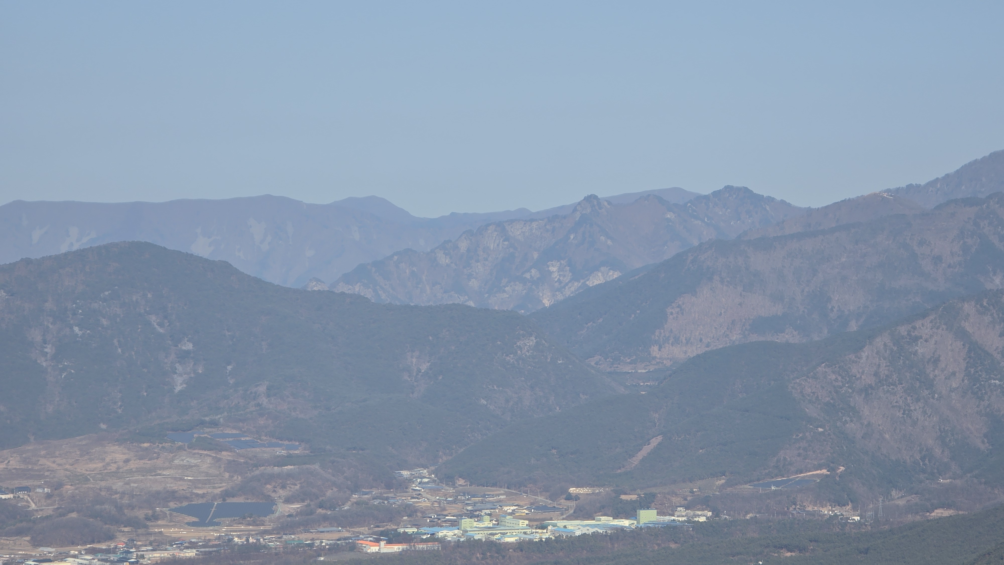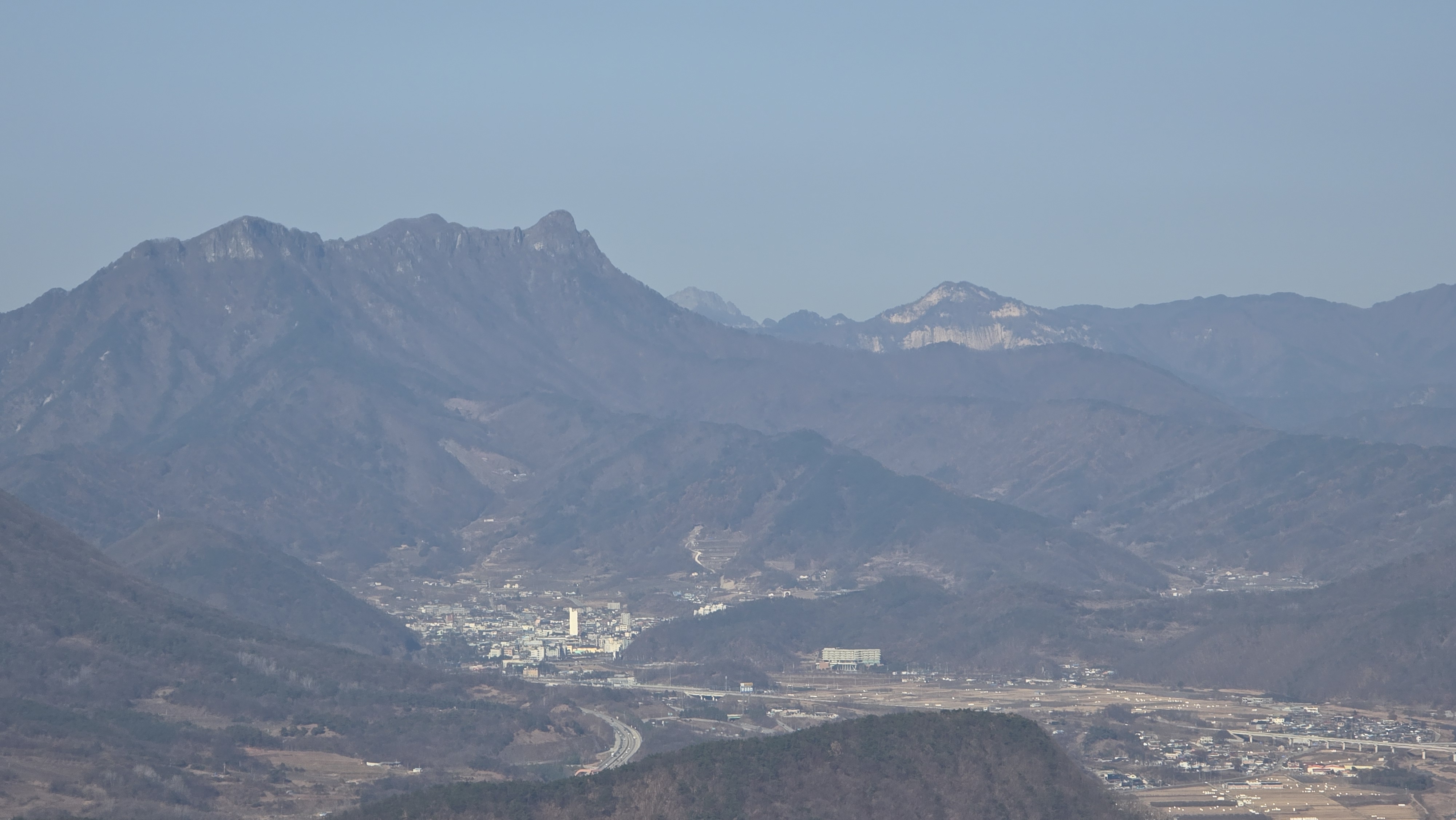 위 사진 줌업 좌측 앞이 봉명산, 그 뒤 중앙에 성주봉~운달산, 우측에 잘린 단산