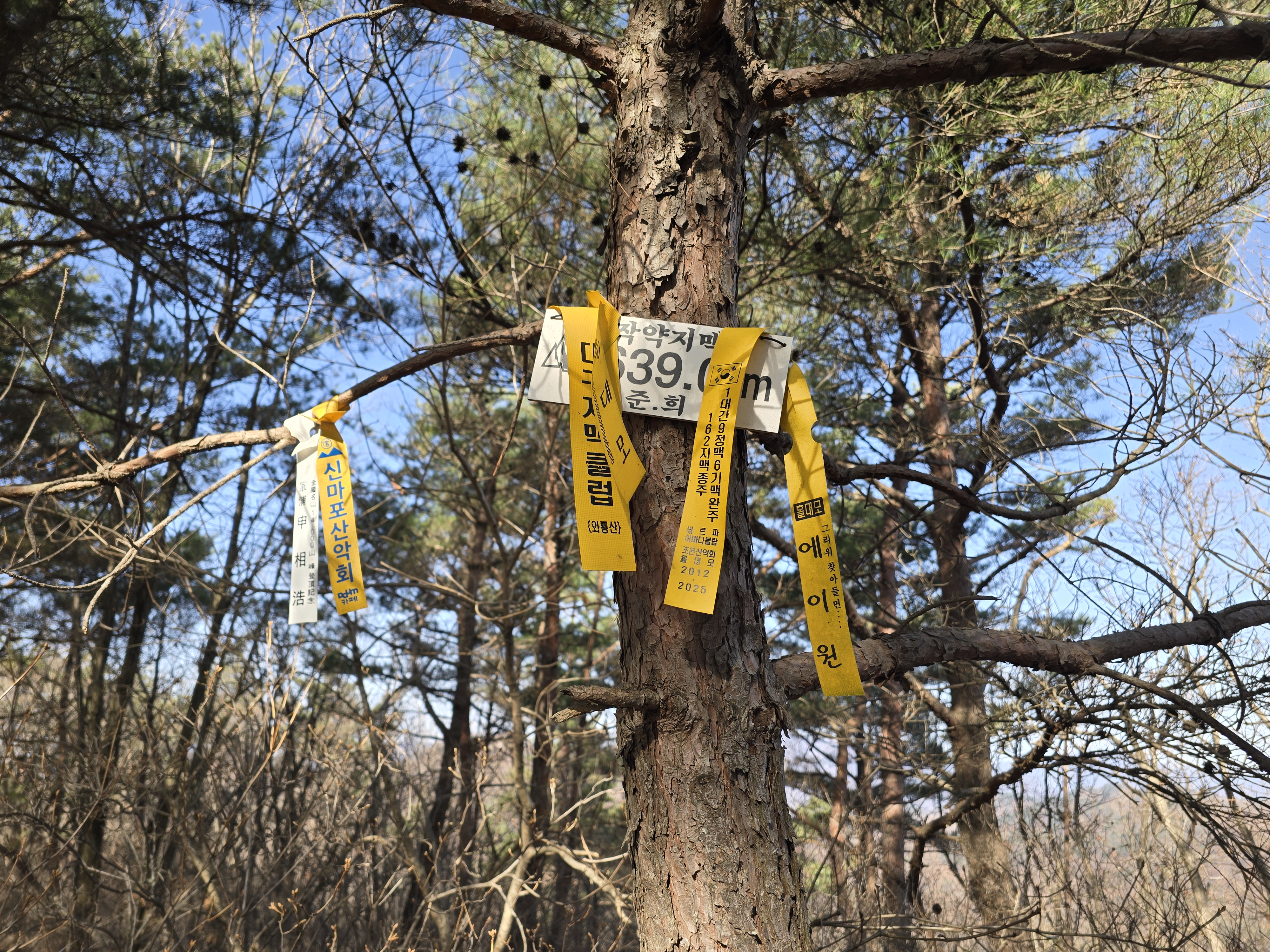 정상석 주변 길주의!!! 좌측 리본이 있는 방향으로 가니 또 리본이 있는걸로 봐서 작약지맥길 우측 아래 깔지로 진행