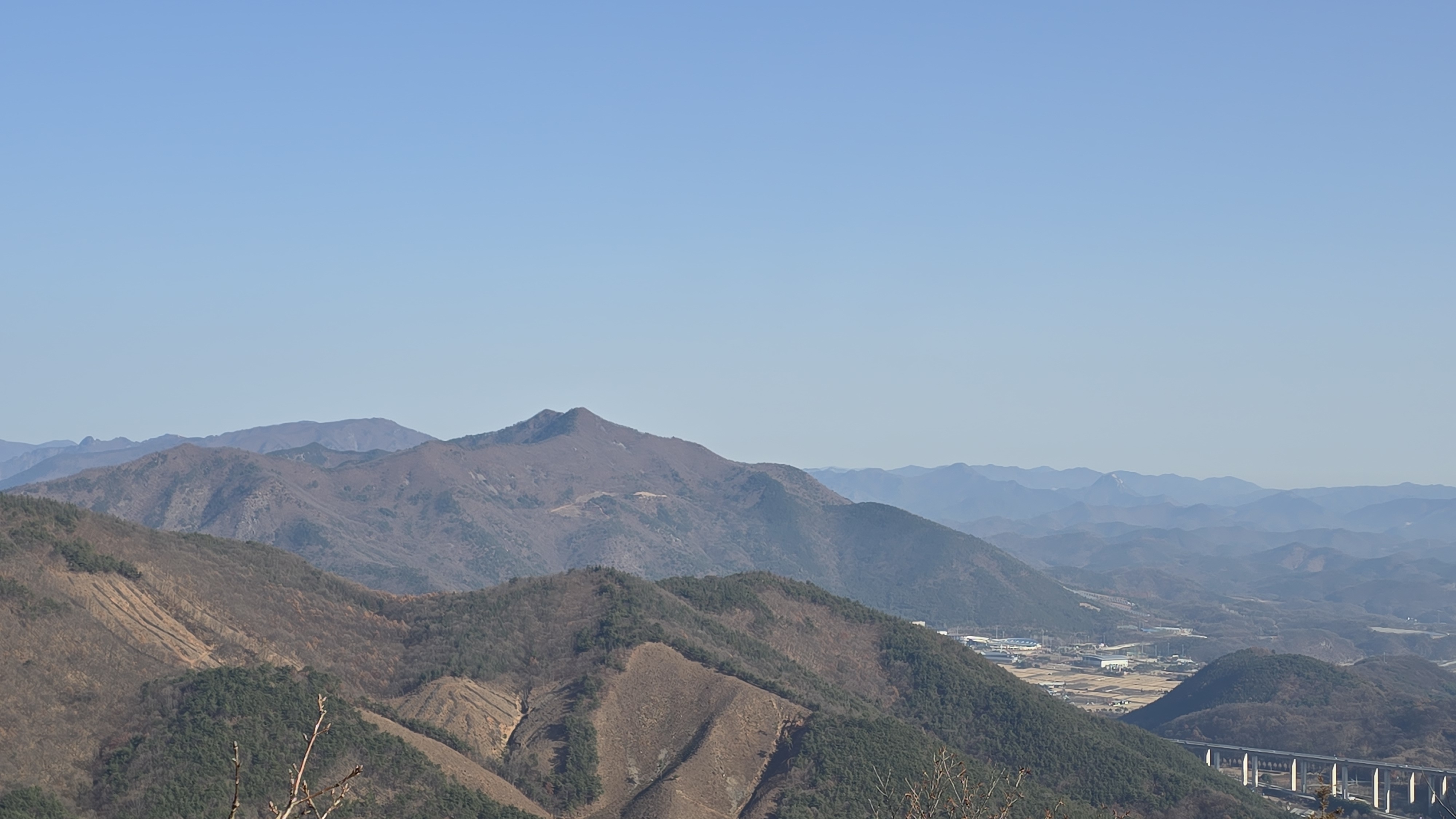 위사진 줌업 좌측 오정산 좌측 너머 평평한 단산, 우측에 공덕산 뾰족한 봉우리가 천주산 우측 뒤로 요즘 많이 찾는 국사봉