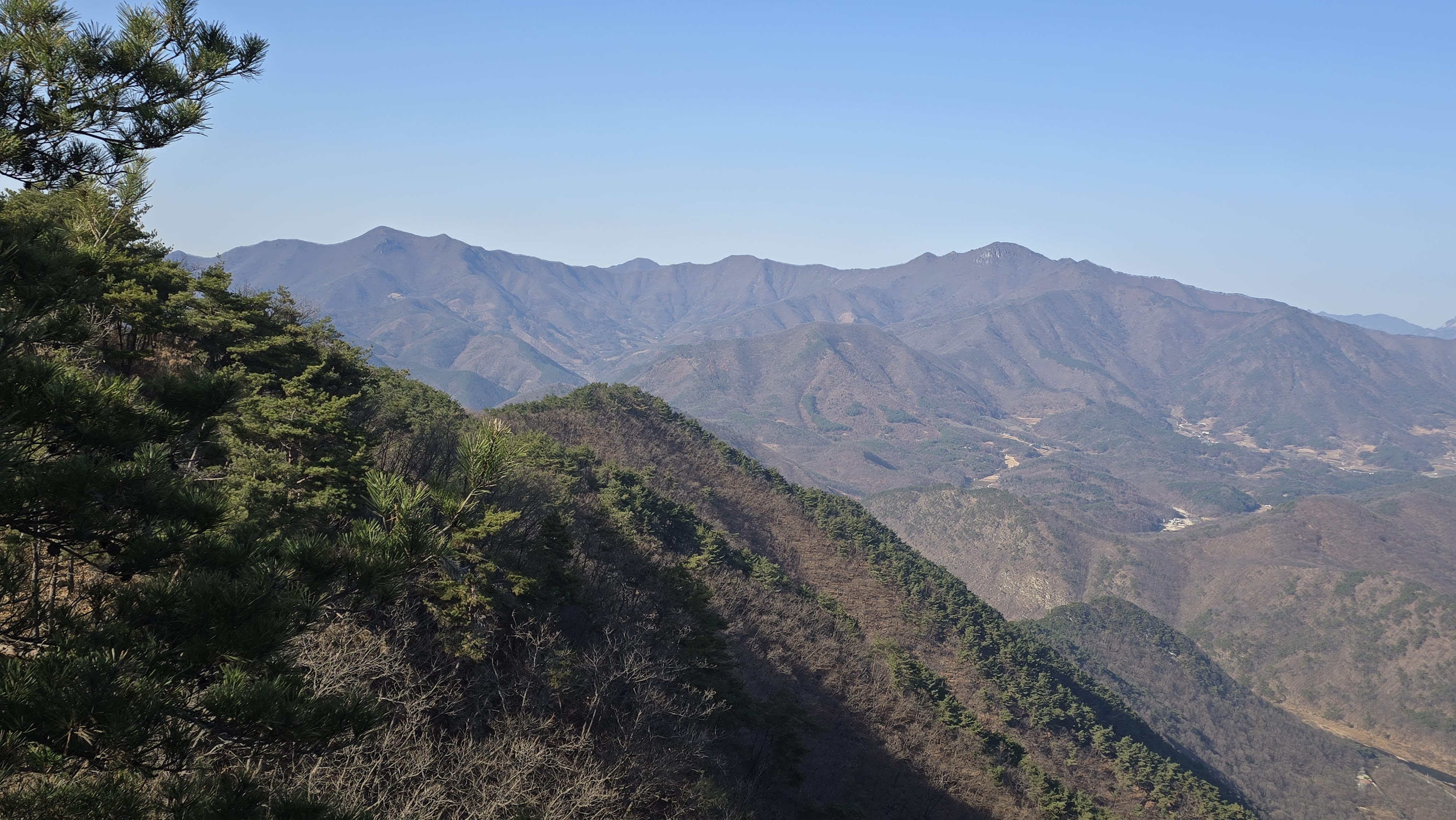 위 사진 줌업 둔덕산,밀재,대야산 둔덕산 뒤에서 담아서 그런지 둔덕산너머 마귀,손녀통시 바위가 가려있다.