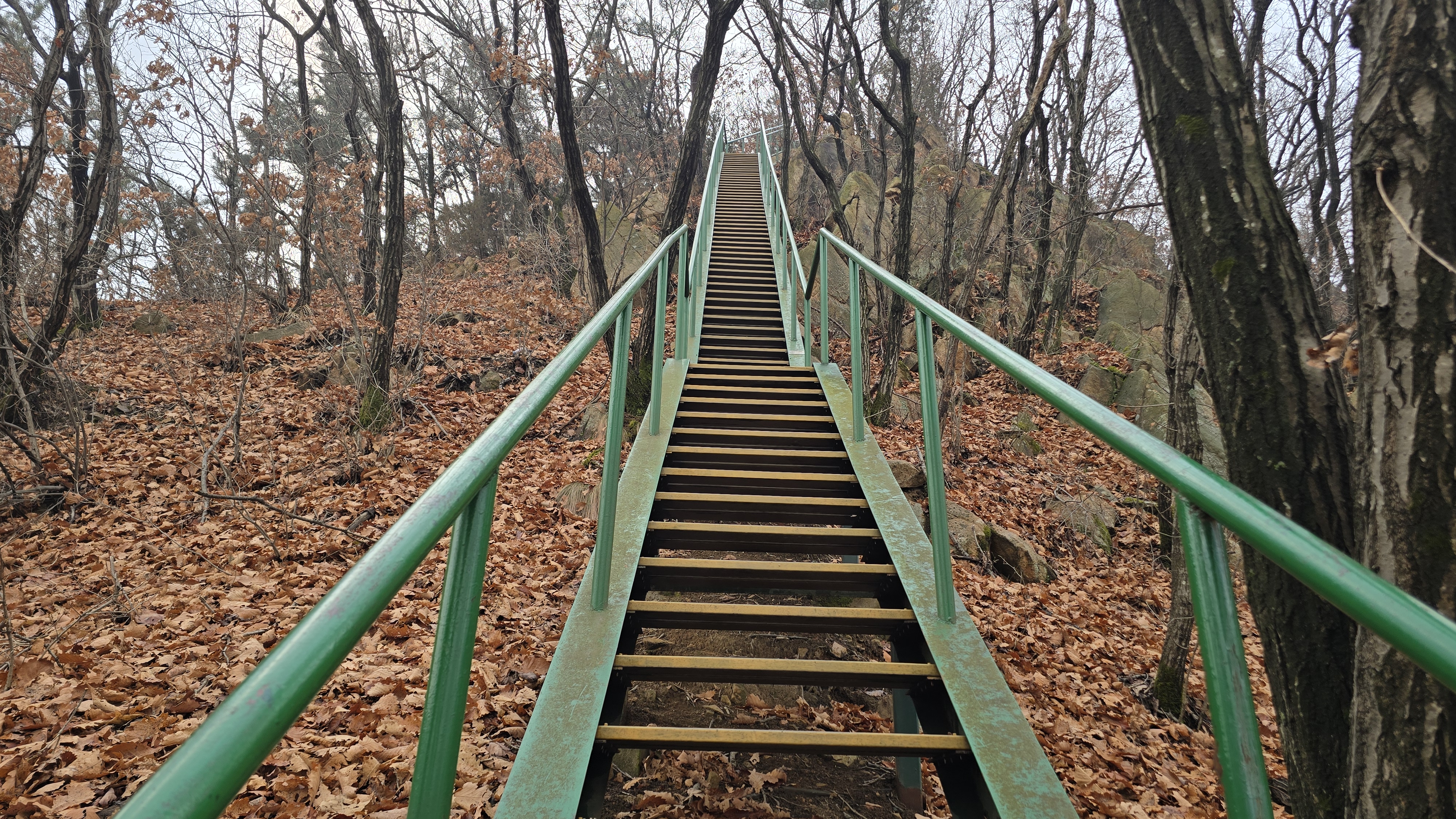 밤골약수터 방향 급경사 철계단 요리로 내려가면 상아산은 내려섰다가 다시 올라야 한다.