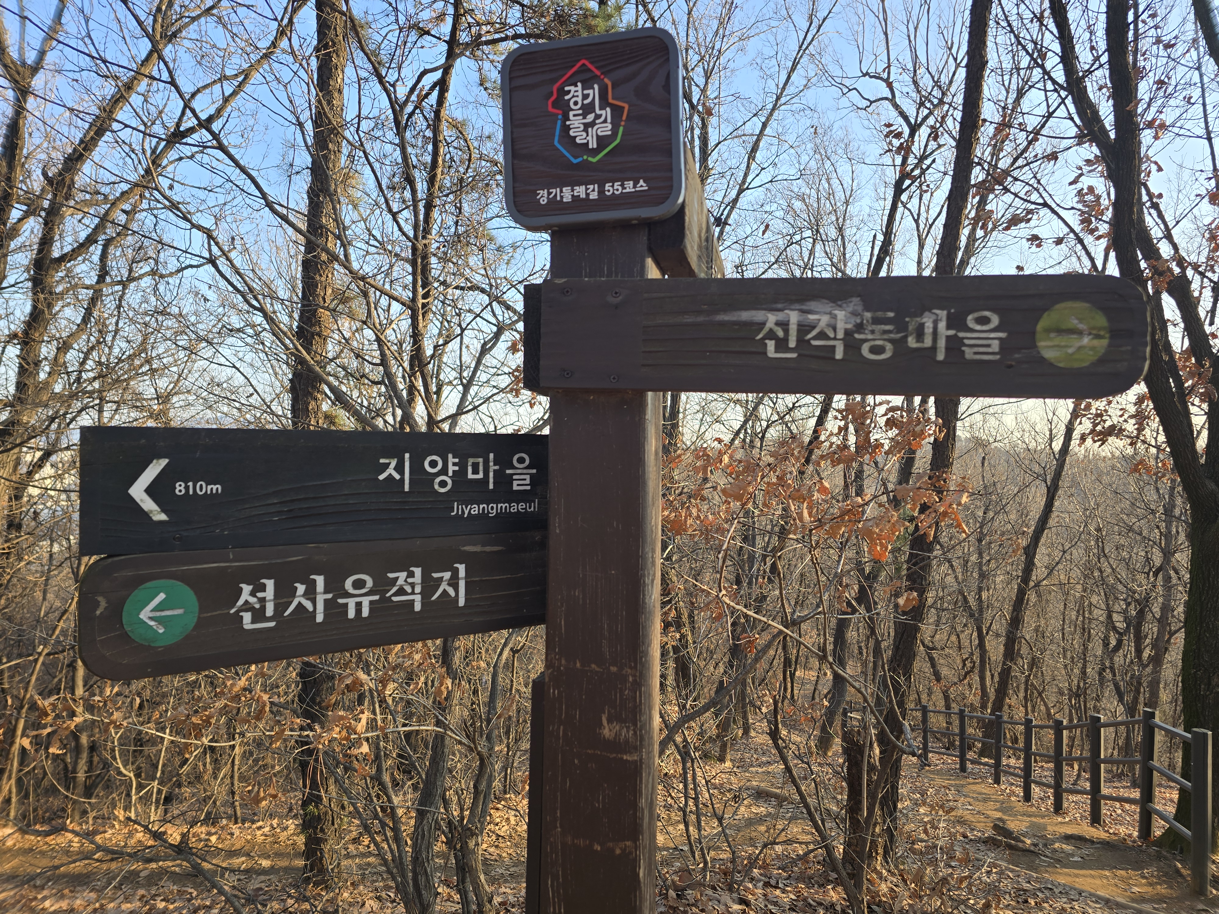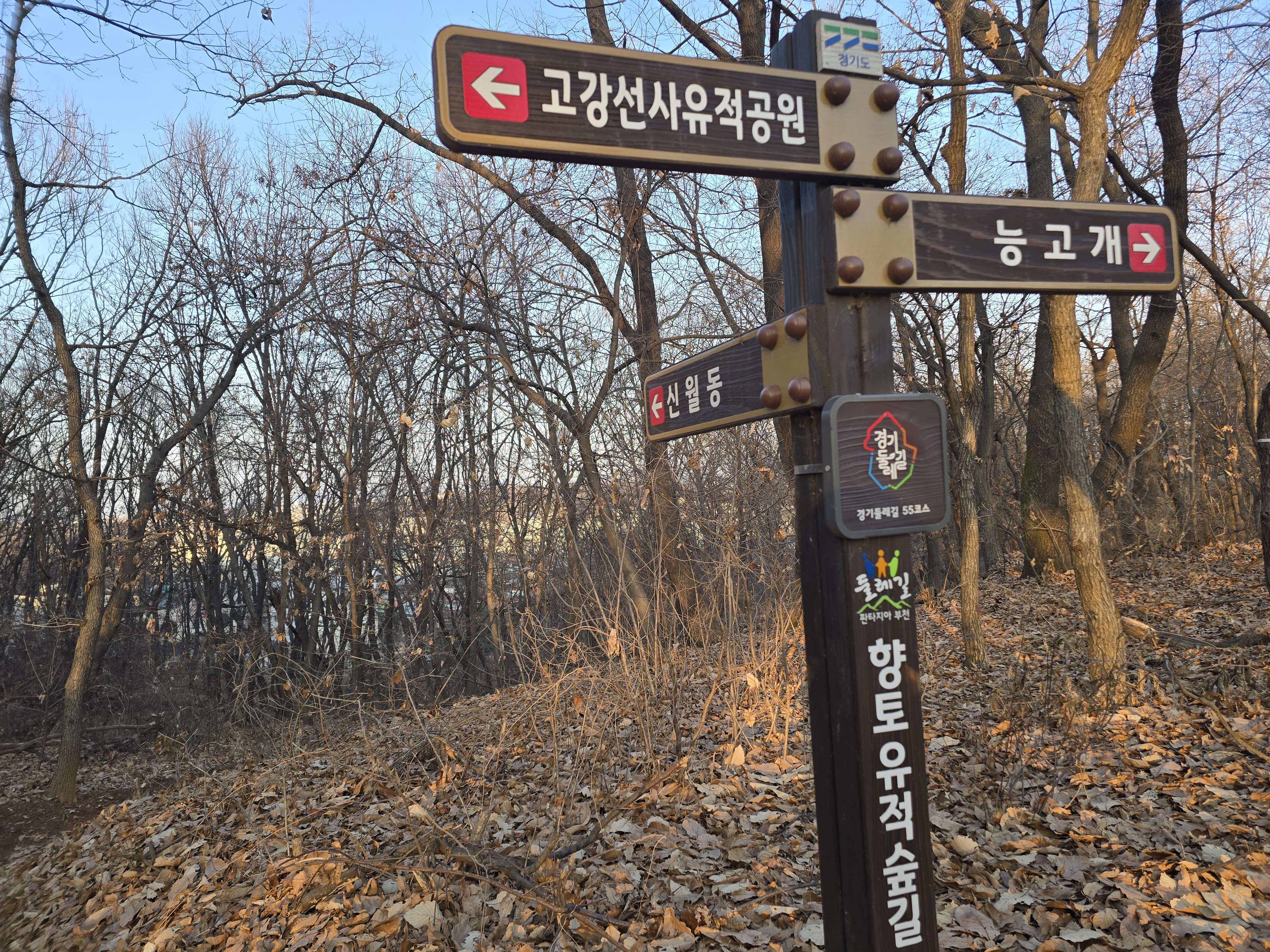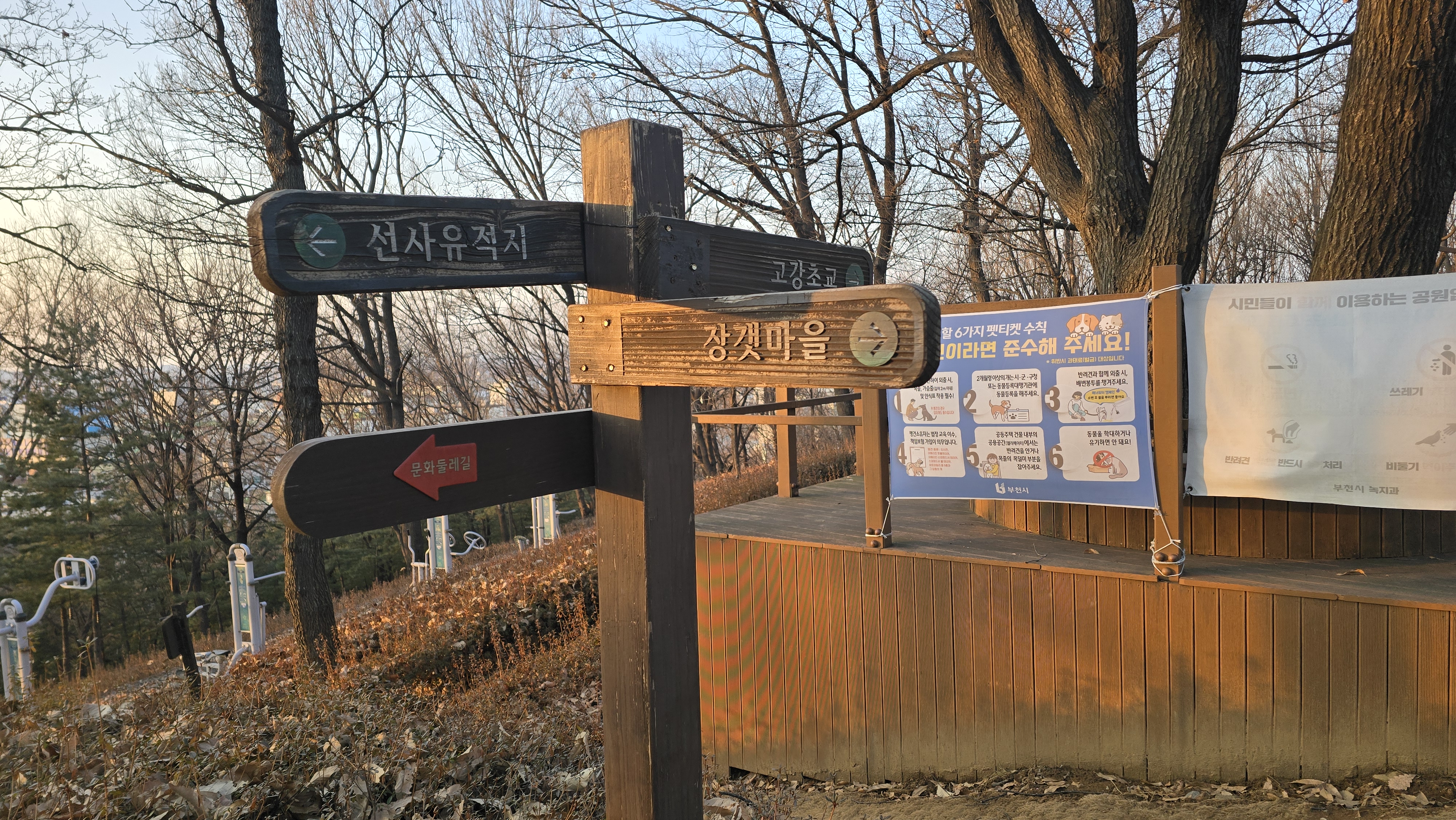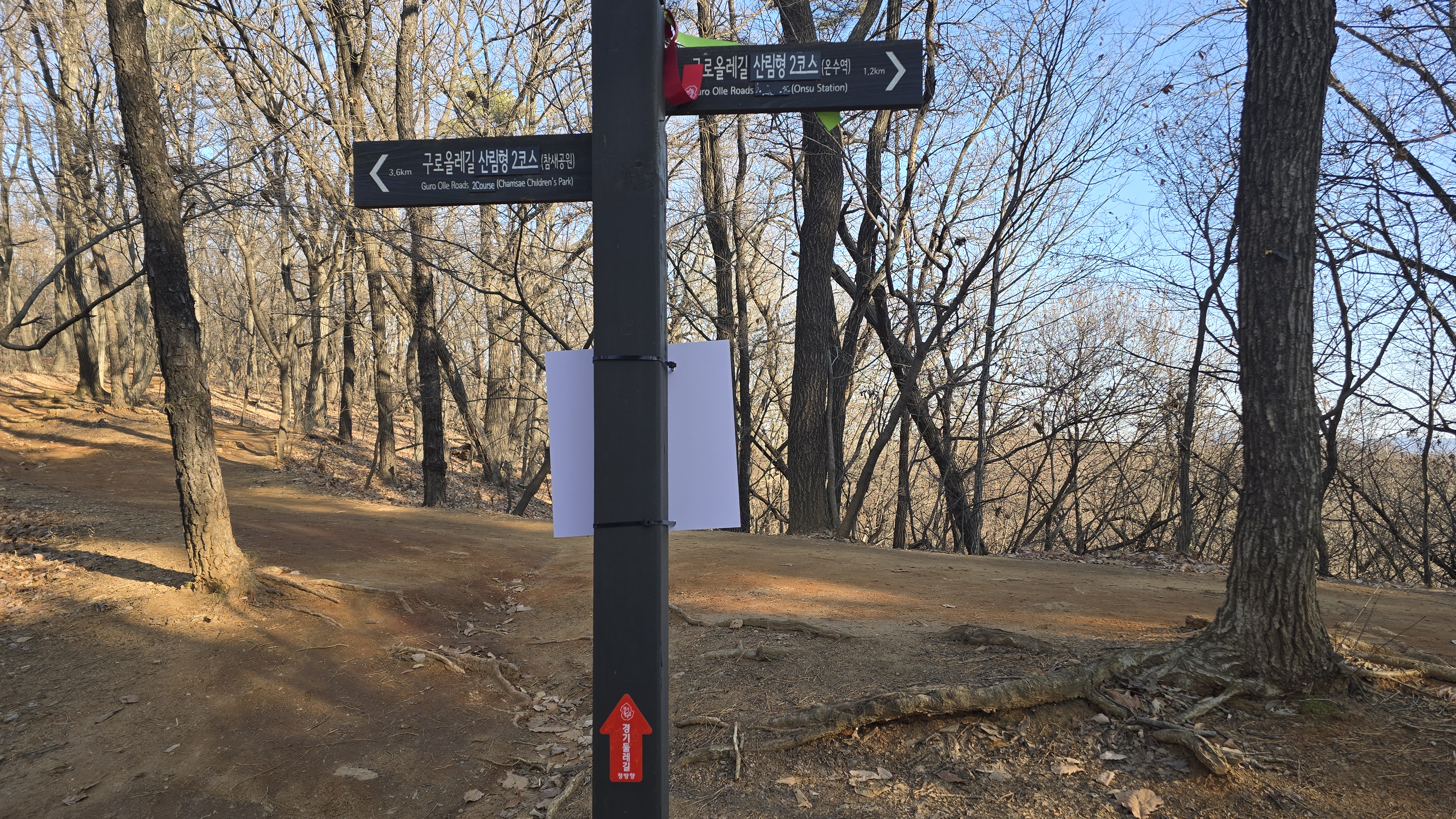 부천고강동 선사유적지 이정표 실종!! 카카오맵을 보니 능선이 양천구 였다. 빛에 반사된 이정표가 신정이펜하우스2단지