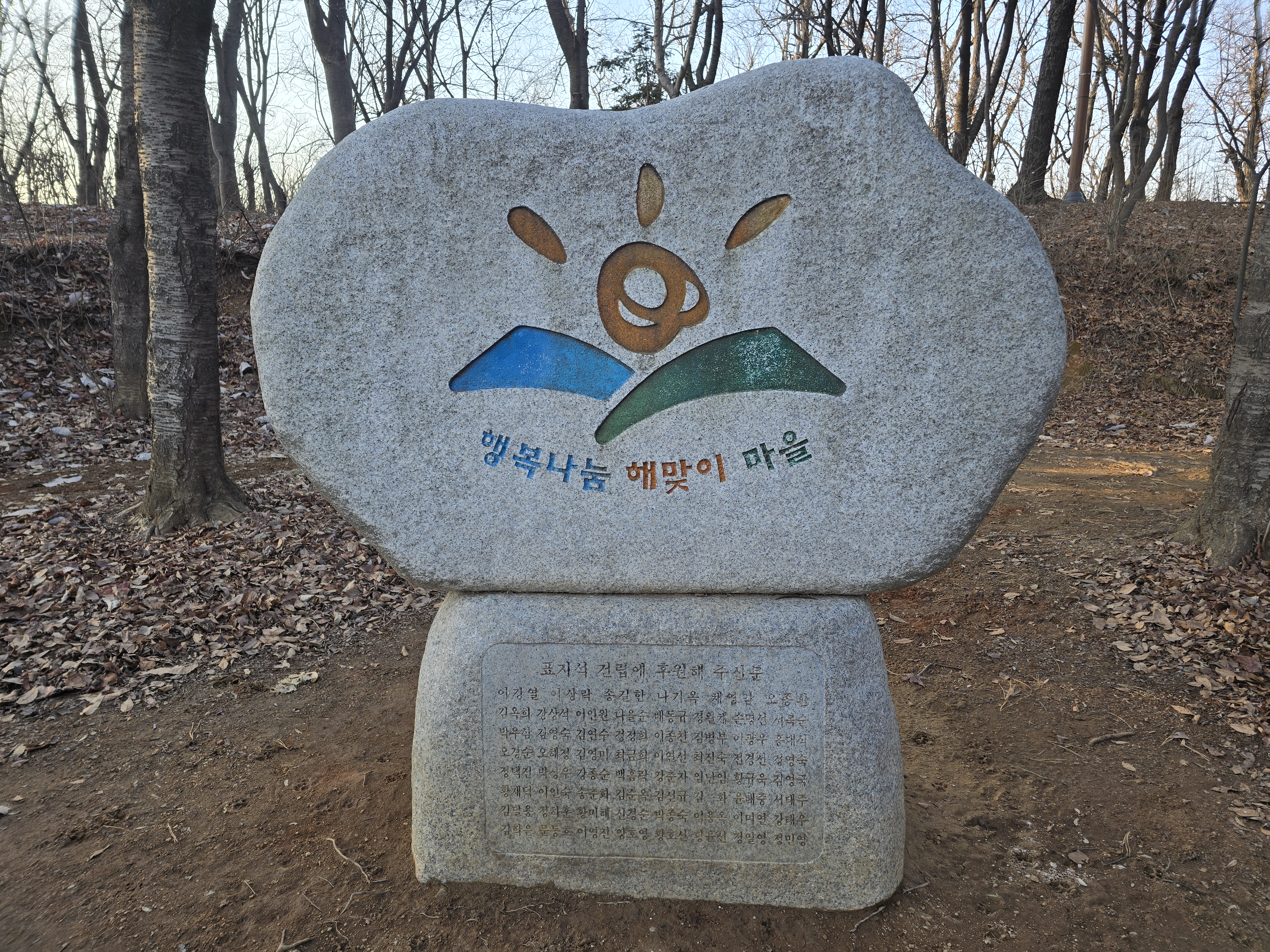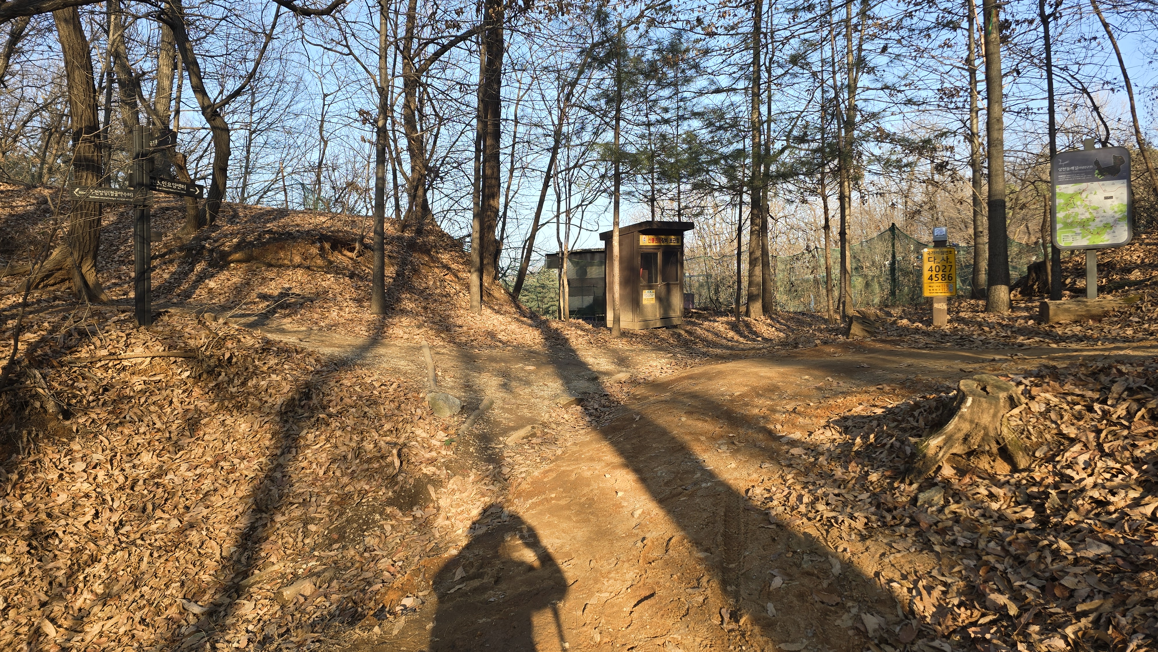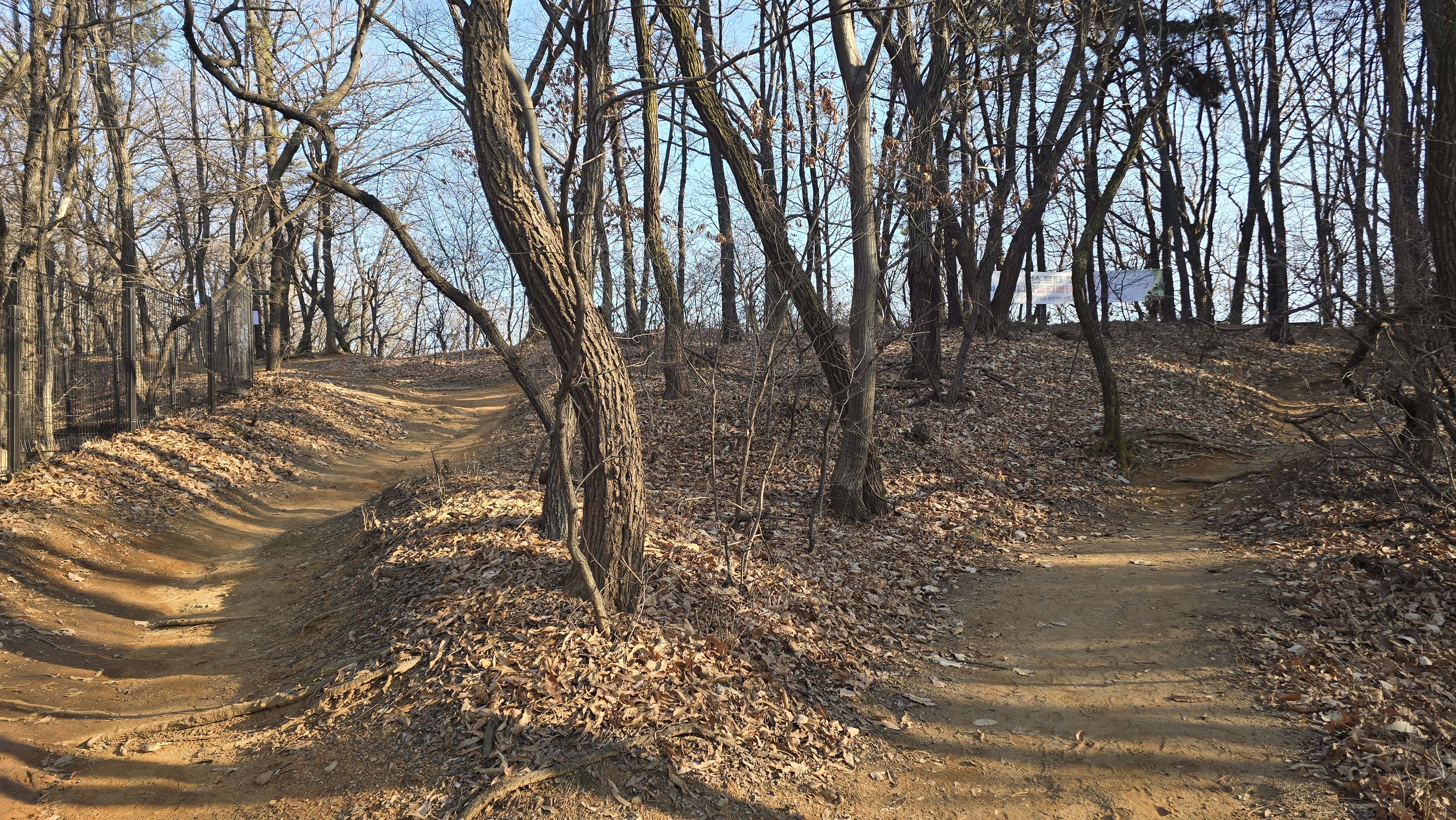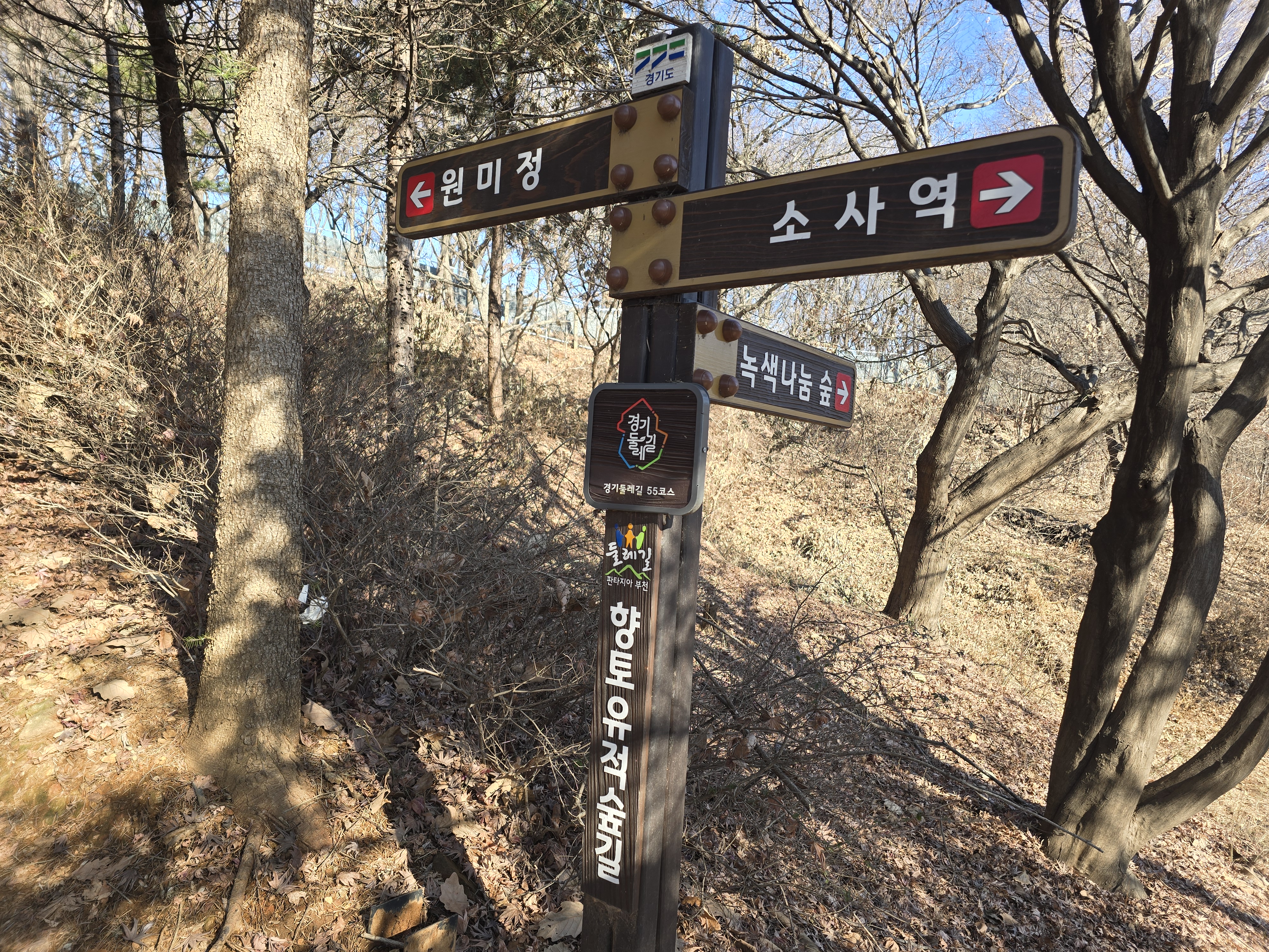 부천고강동 선사유적지 이정표 실종!! 카카오맵을 보니 능선이 양천구 였다. 빛에 반사된 이정표가 신정이펜하우스2단지