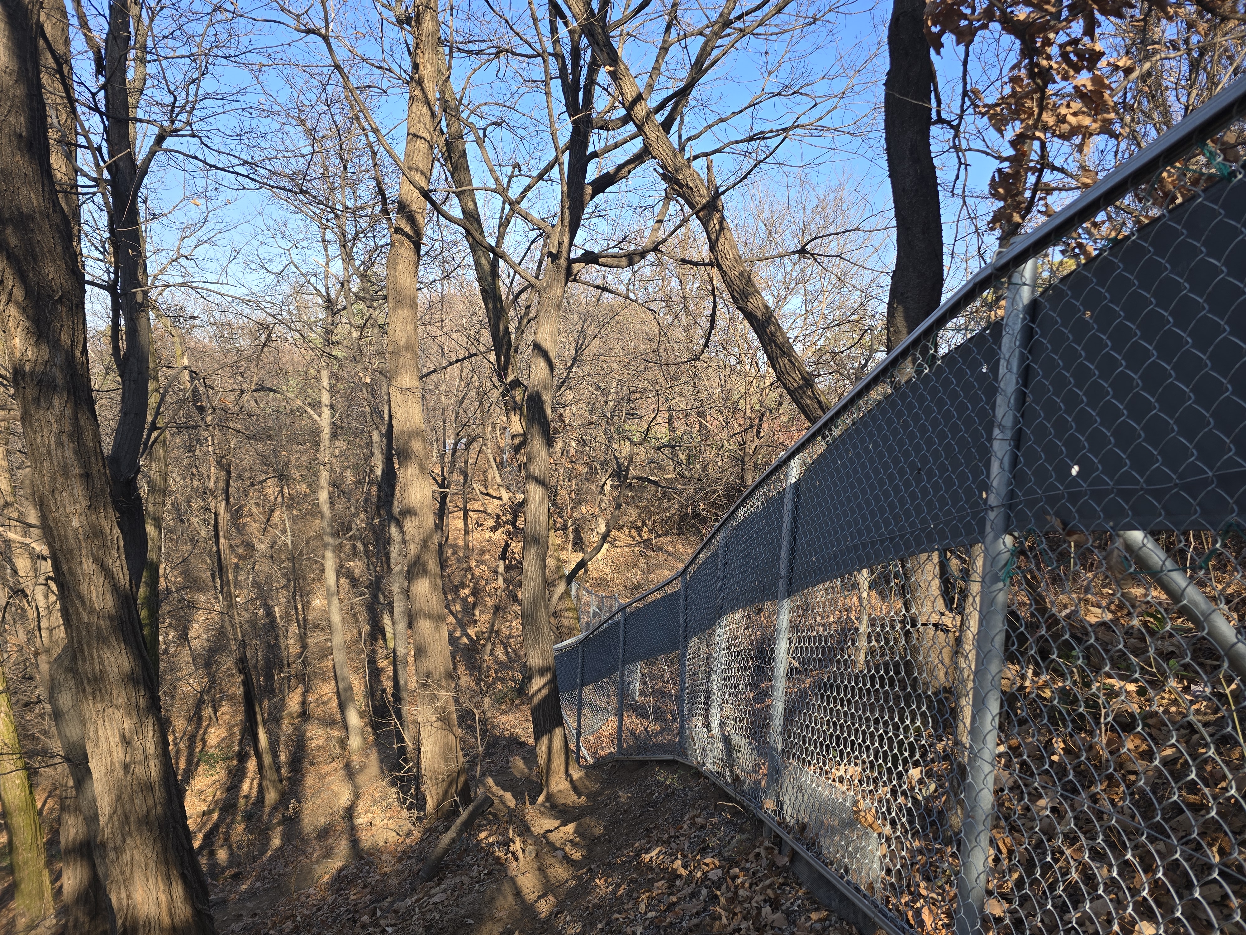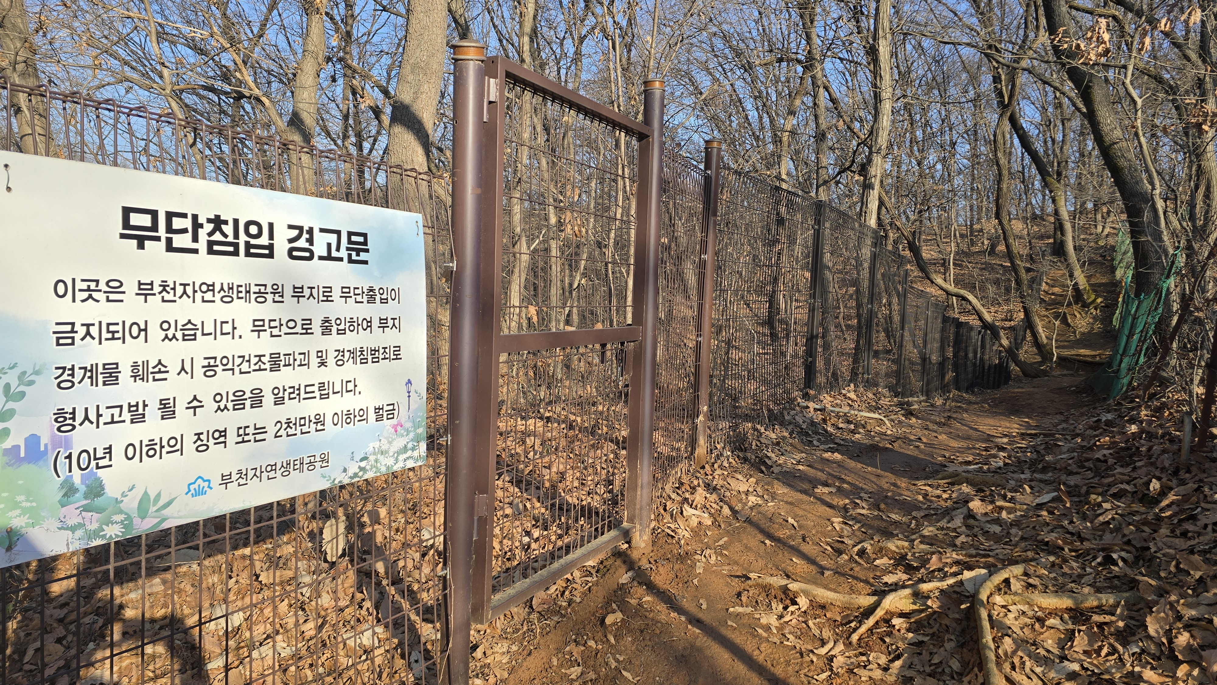 부천과 서울의 경계가 되는 부천자연생태공원의 철제 울타리따라 진행