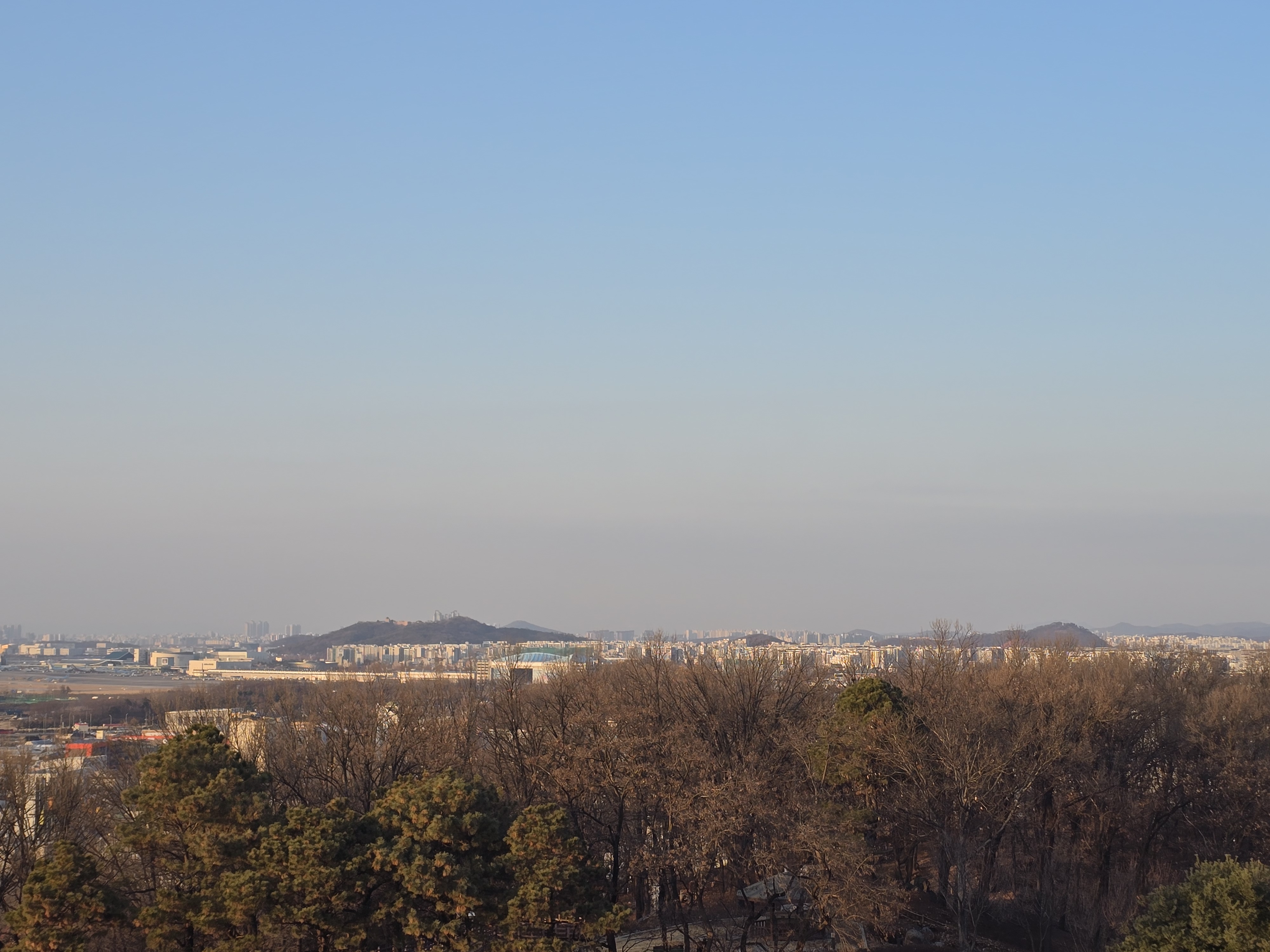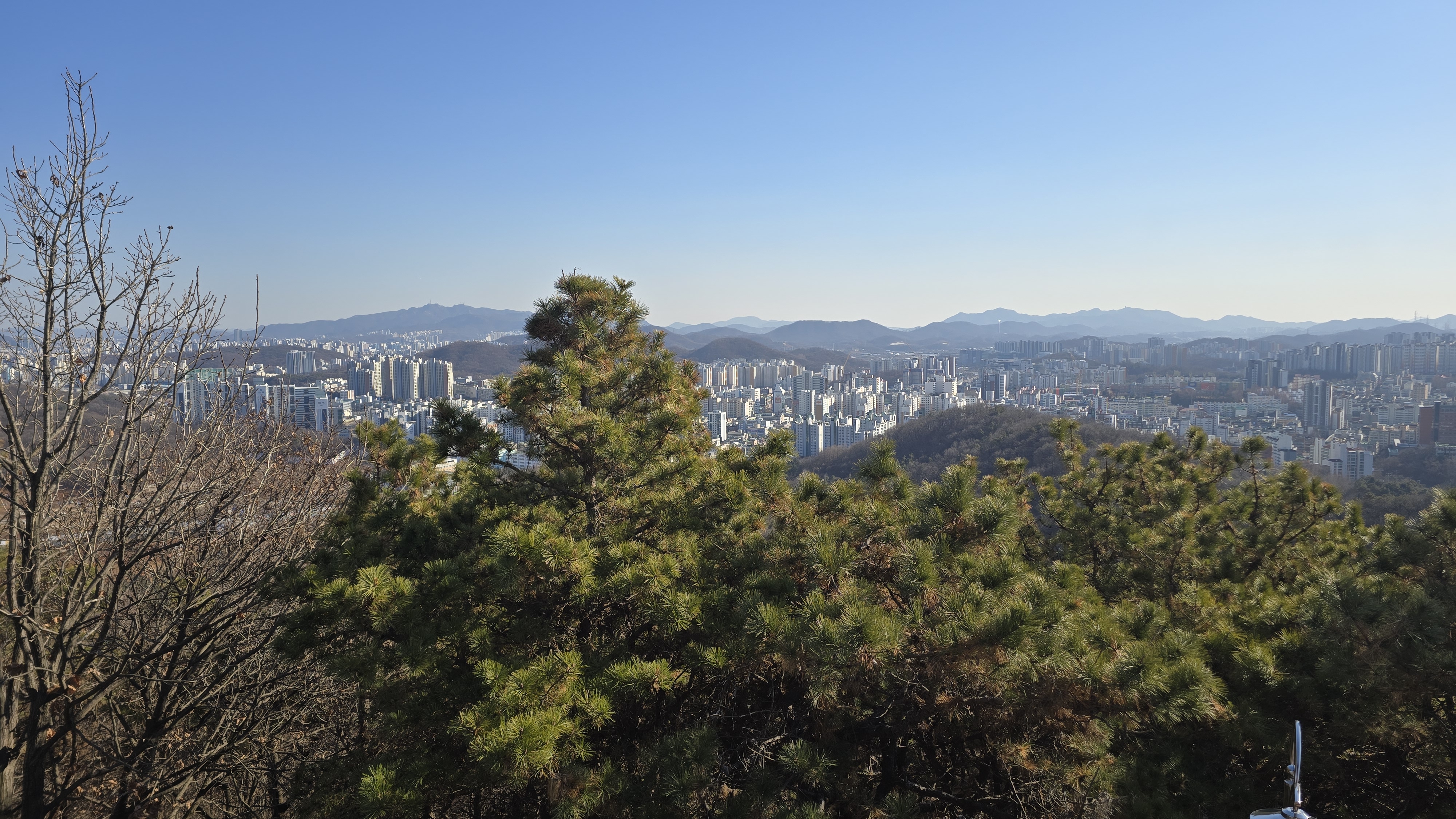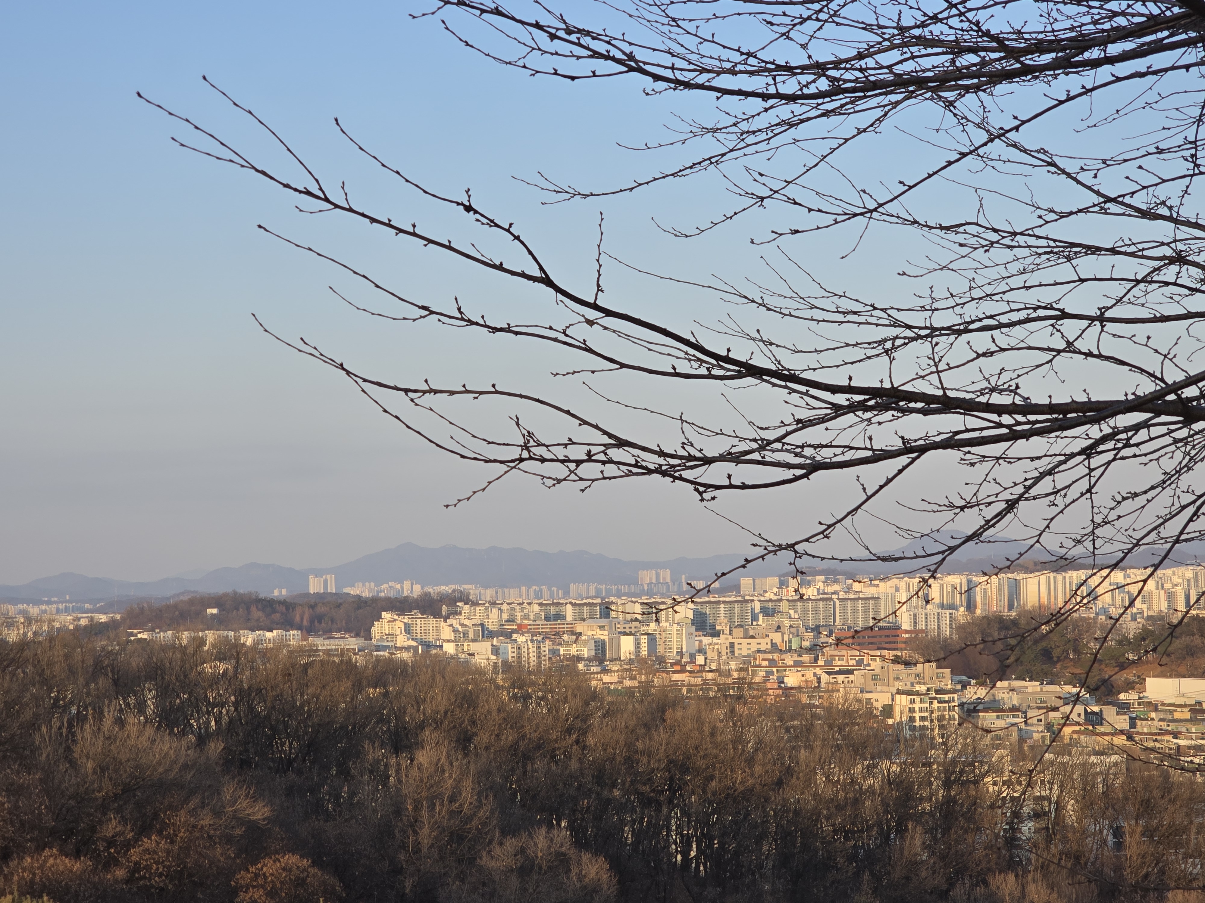 칼바람이 불어서 대충~가늠해 본다. 줌업해본 멀리 바라산,백운산,청계산 우측 평평한 구름산 그 좌측으로 도덕산 맨앞이 개웅산 방향
